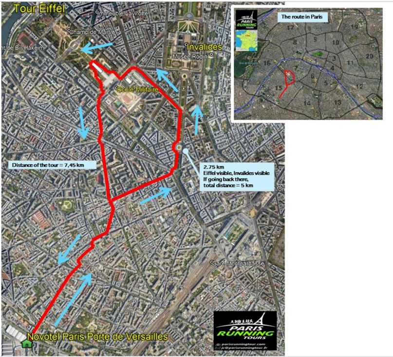 The tour is a non-stop run of 7.45 km, and the goal is to be back at 7:30 AM, in theory, a speed of 7.45 km/h. The route is going through not very touristic areas (the “deep” 15th arrondissement, even though it has an authentic charm) but the idea is to go more in the centre and see at least two iconic spots, the Hotel des Invalides and its magnificent golden dome, and the Eiffel tower.